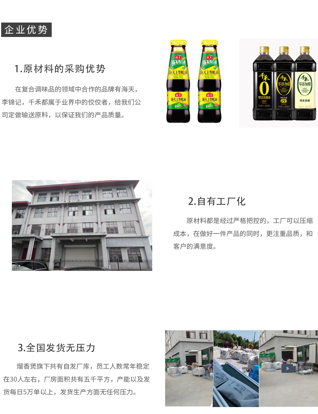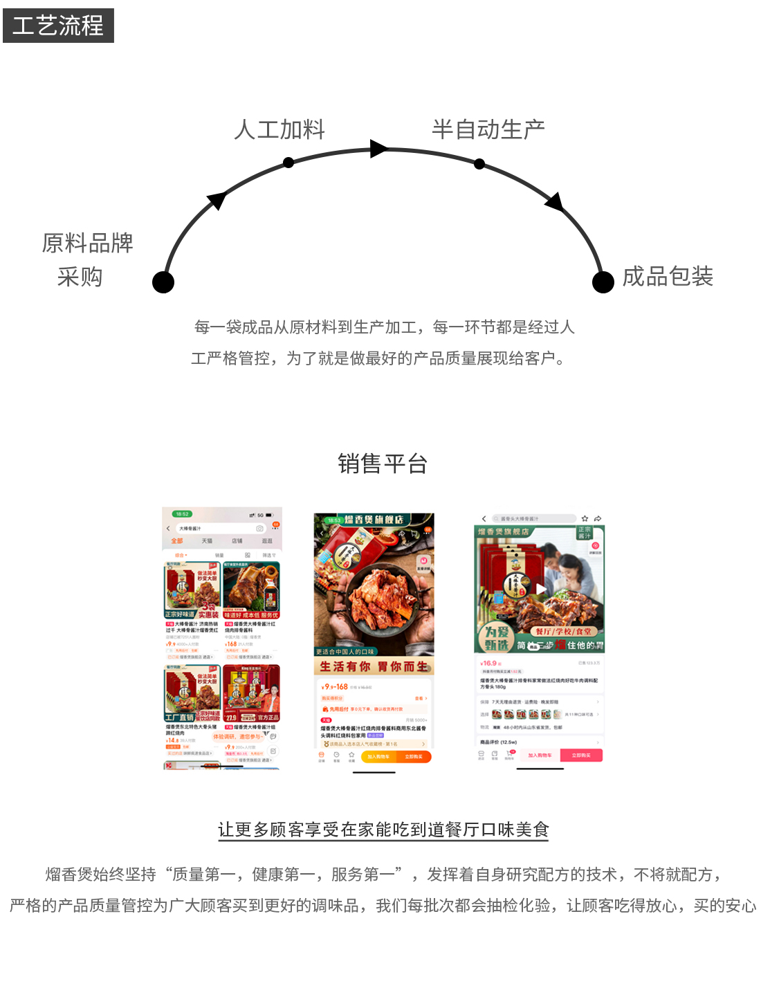 目前公司主要生产和销售复合型调味品(黄焖鸡酱汁,大棒骨酱汁,炒菜酱汁,等),是一家具有合格生产固态,半固态,液态调味料生产厂家,山东智祺食品有限公司成立于2021年,智祺在济南设有工厂,占地面积达到五千多平方,现有员工30多人,两个厂区仓库面积达一千多平方,充足的原材料满足大量的供货需求。山东富乐鸡餐饮管理有限公司在各大平台都有销售,并拥有完善优秀的运营团队和研发团队。产品的生产从原材料到生产加工,每一环节都是经过人工严格管控,准求优品质,注重产品质量,为了就是做更好的产品展现给客户。